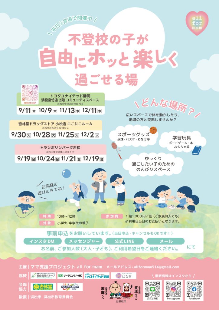 『不登校の子が自由にホッと楽しく過ごせる場』の開催について 公開日: 2025年9月25日 『不登校の子が自由にホッと楽しく過ごせる場』をご案内に記載の日程で開催します。詳細は添付のチラシをご覧ください。